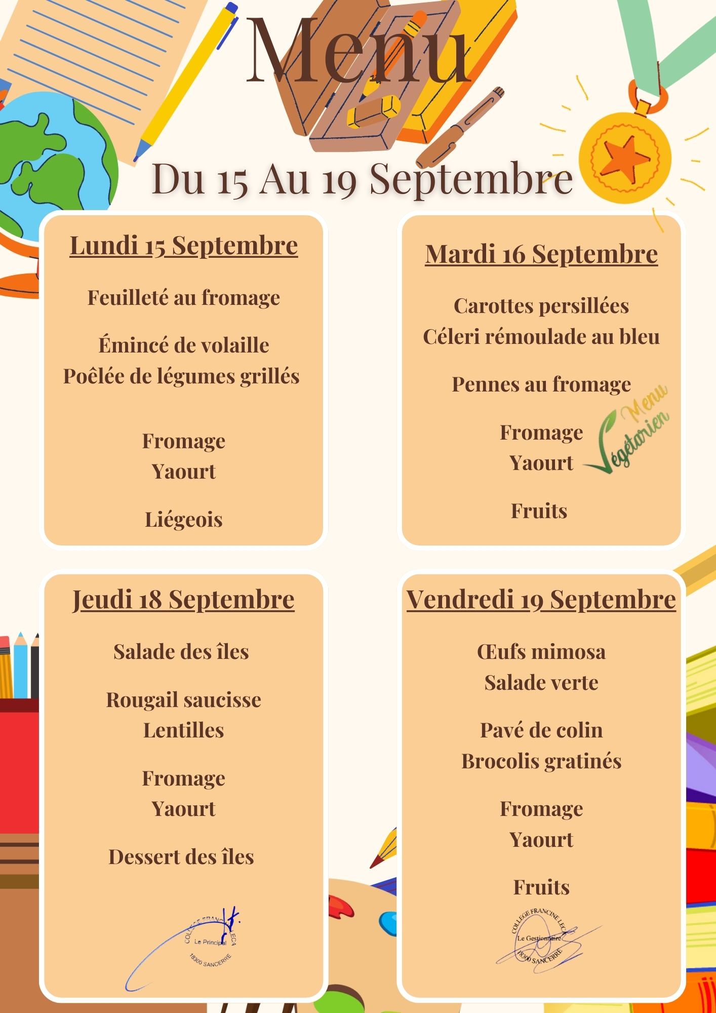 MENU DU 15 AU 19 SEPTEMBRE 2025